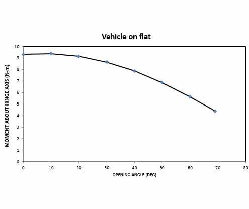The torque of the hinge axis of the door varies depending on the opening angle of the door as well as the tilt and incline or decline grade. For example, Figure 1 below shows the torque on the hinge axis of the front door as the door opens to its full open position. It shows how the motor delivers a higher torque when the door angle is small and that the torque decreases as the door opens. This is due to the geometry of the actuator rod between motor and door. Figure 2 shows the same torque but on a 10% grade nose upwards. Note that the scale of the y-axis is much larger. The further the door opens, the more torque the motor needs to deliver. This is because gravity has a larger effect on the door as it opens. Similarly, the torque curves vary for all ranges of vehicle orientation.
