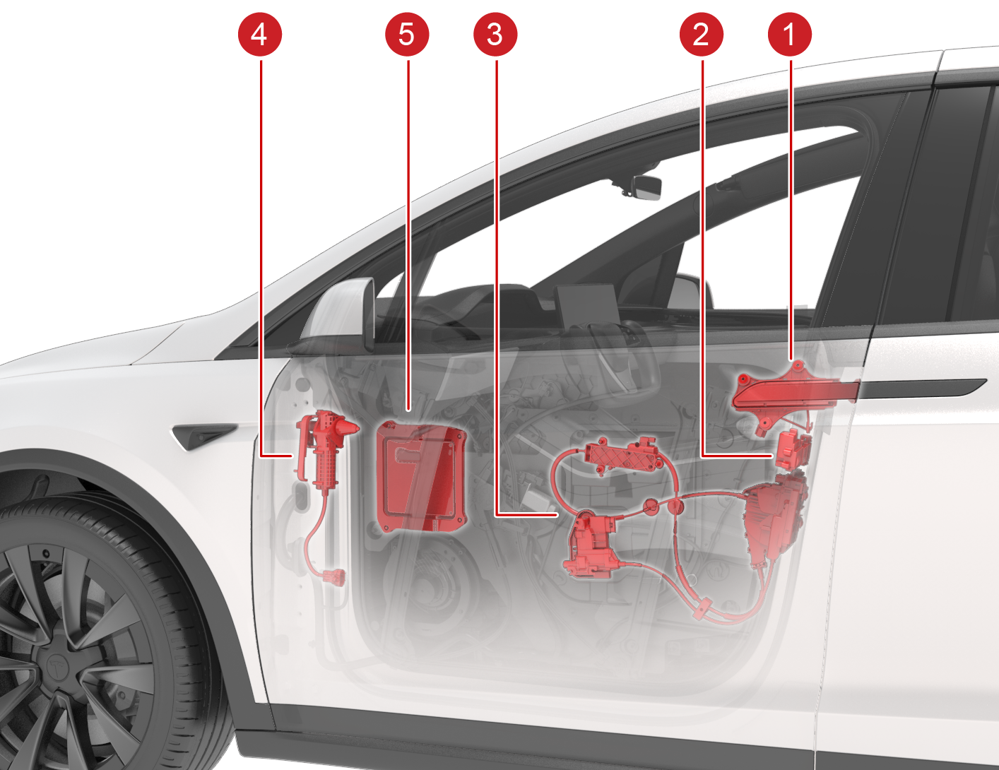 2021+ Model X features a power front door which allows for more usability and comfort in entering and leaving the vehicle than a conventional door. The door operation has the ability to work with 100% electrical operation, including all latches and movement actuation. The power front door system is comprised of a standard door mounted on free-moving hinges, powered by an electric DC motor (actuator). There is an exterior door push handle that is pressed to command the door to open from outside of the vehicle. There is a button on the interior handles used to open the doors when engaged. If the button malfunctions or there is no power supplied to the front doors, then there is a release cable which acts as a mechanical backup and releases the latch.