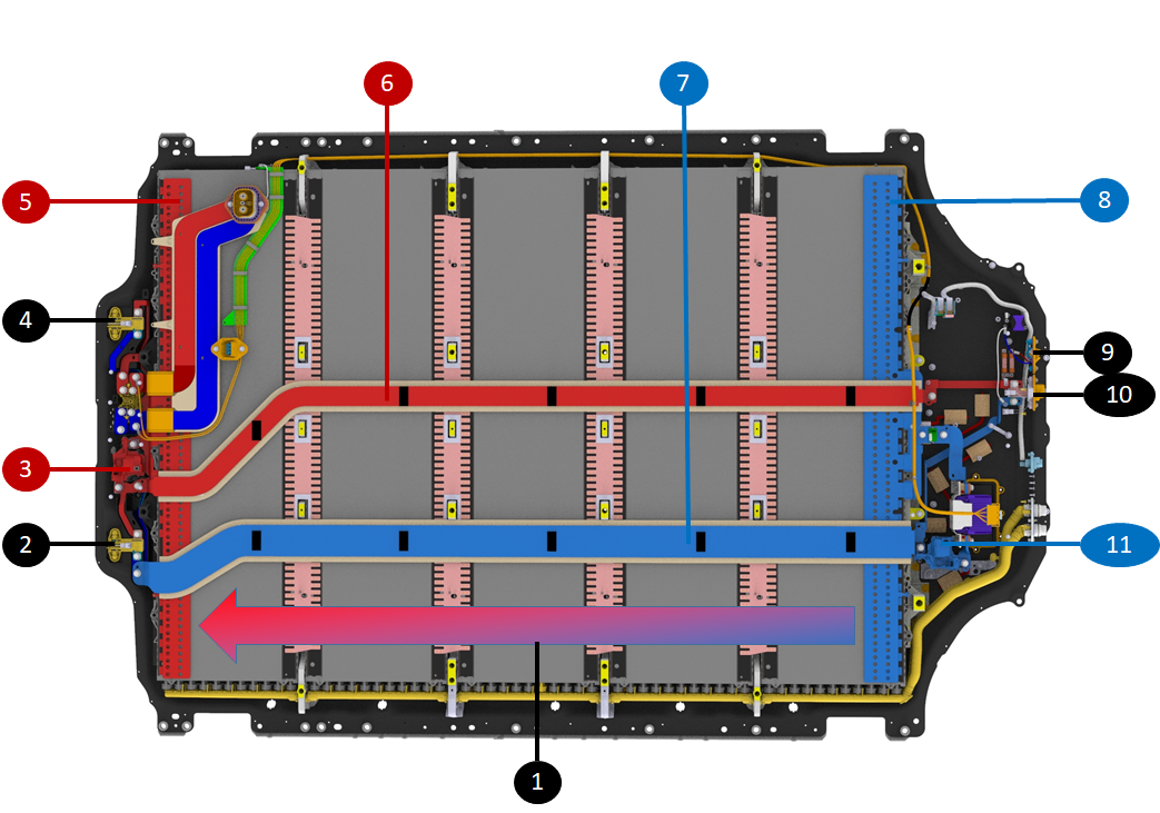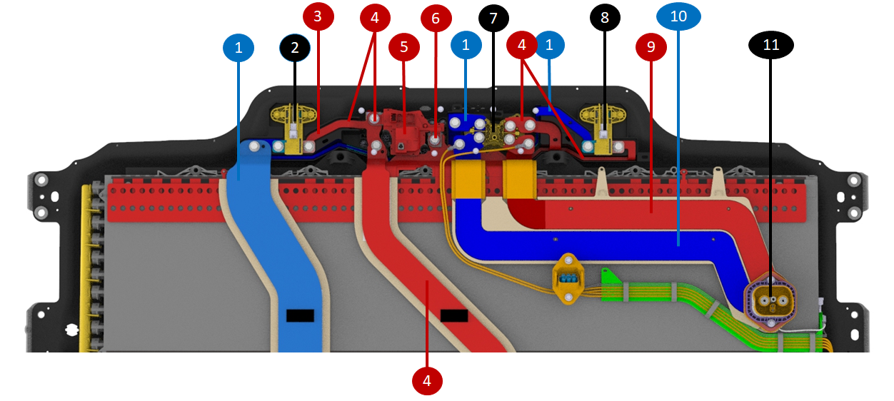 | 1. Voltage built up from most negative to most positive terminal via each brick, each module 2. Rear drive unit #1 HV connector 3. Positive contactor 4. Rear drive unit #2 HV connector 5. Most positive terminal 6. Positive busbar bringing DC link positive to the front of the HV battery 7. Negative busbar bringing DC link negative to the rear of the HV battery 8. Most negative terminal 9. Heat pump HV connector 10. Front drive unit HV connector 11. Negative contactor |