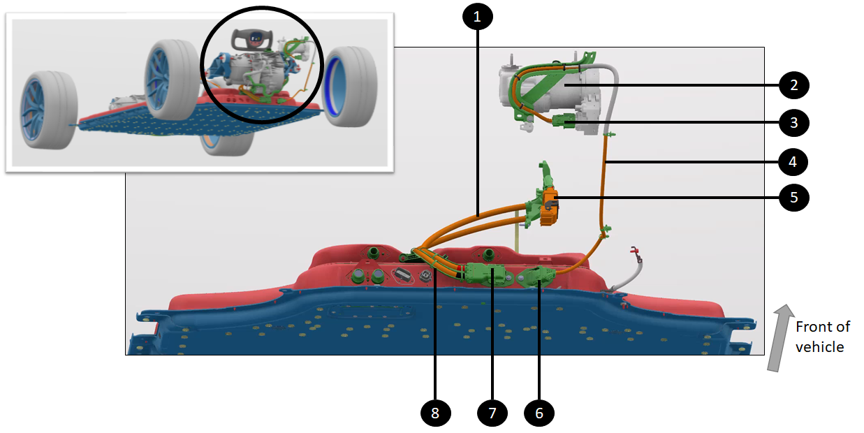 | 1. Front drive unit HV harness 2. HV A/C compressor 3. HV connector at HV A/C compressor 4. HV A/C compressor HV harness 5. HV connector at front drive unit 6. HV A/C compressor HV connector at front ancillary bay 7. Front drive unit connector at front ancillary bay 8. Bracket guiding front drive unit HV harness |