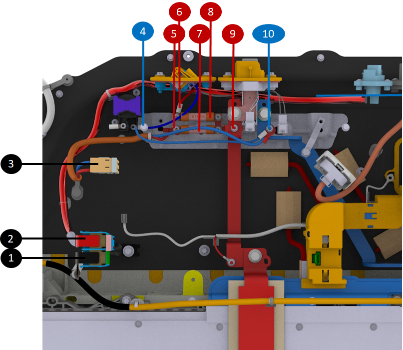 | 1. DCDC 12V negative (directly bolted down to enclosure) 2. DCDC 12V positive (route to single pole connector at front of HV battery) 3. HV connector to PCS (connect DC link to PCS) 4. DC negative cable to/from HV A/C compressor connector 5. DC link positive to PCS 6. DC positive to HV A/C compressor connector 7. 63A fuse on PCS DC link positive 8. 63A fuse on HV A/C compressor DC link positive 9. DC link positive tap for HV A/C compressor, PCS, and Electromagnetic Interference (EMI) filter 10. DC link negative tap for HV A/C compressor, PCS and EMI filter |