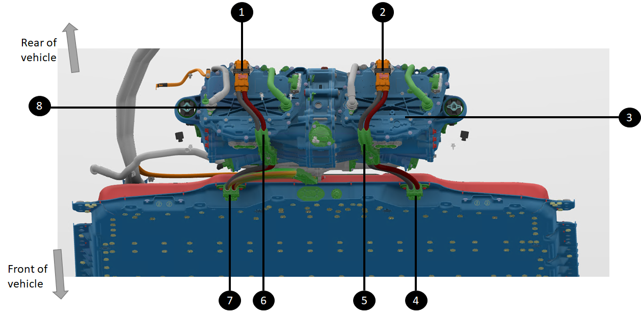 | 1. Left rear drive unit HV connector 2. Right rear drive unit HV connector 3. Right rear drive unit 4. Right HV battery connector to right rear drive unit 5. Bracket holding HV harness to right rear drive unit 6. Bracket holding HV harness to left rear drive unit 7. Left HV battery connector to right rear drive unit 8. Left rear drive unit |