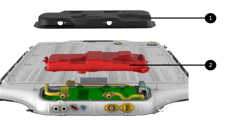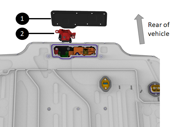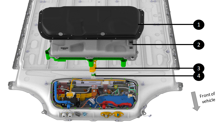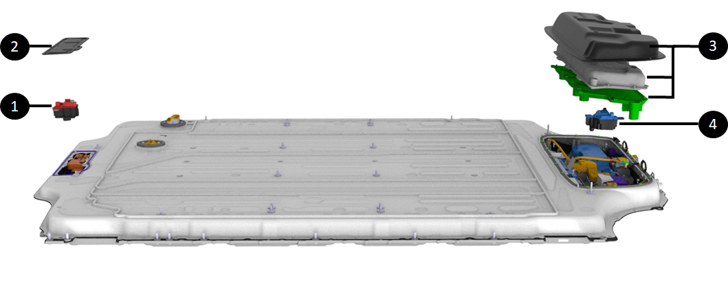 | 1. Location of pyro-disconnect in the HV battery, or pyro-disconnect cave 2. Pyro-disconnect access cover 3. Front Ancillary Bay access cover 4. Rear access panel cover |
