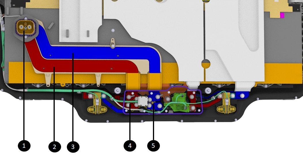 | 1. HV battery inlet charge port busbar connector 2. Positive fast charge busbar 3. Negative fast charge busbar 4. Positive contactor of fast charge contactor assembly connecting positive fast charge busbar to positive DC link 5. Negative contactor of fast charge contactor assembly connecting negative fast charge busbar to negative DC link |