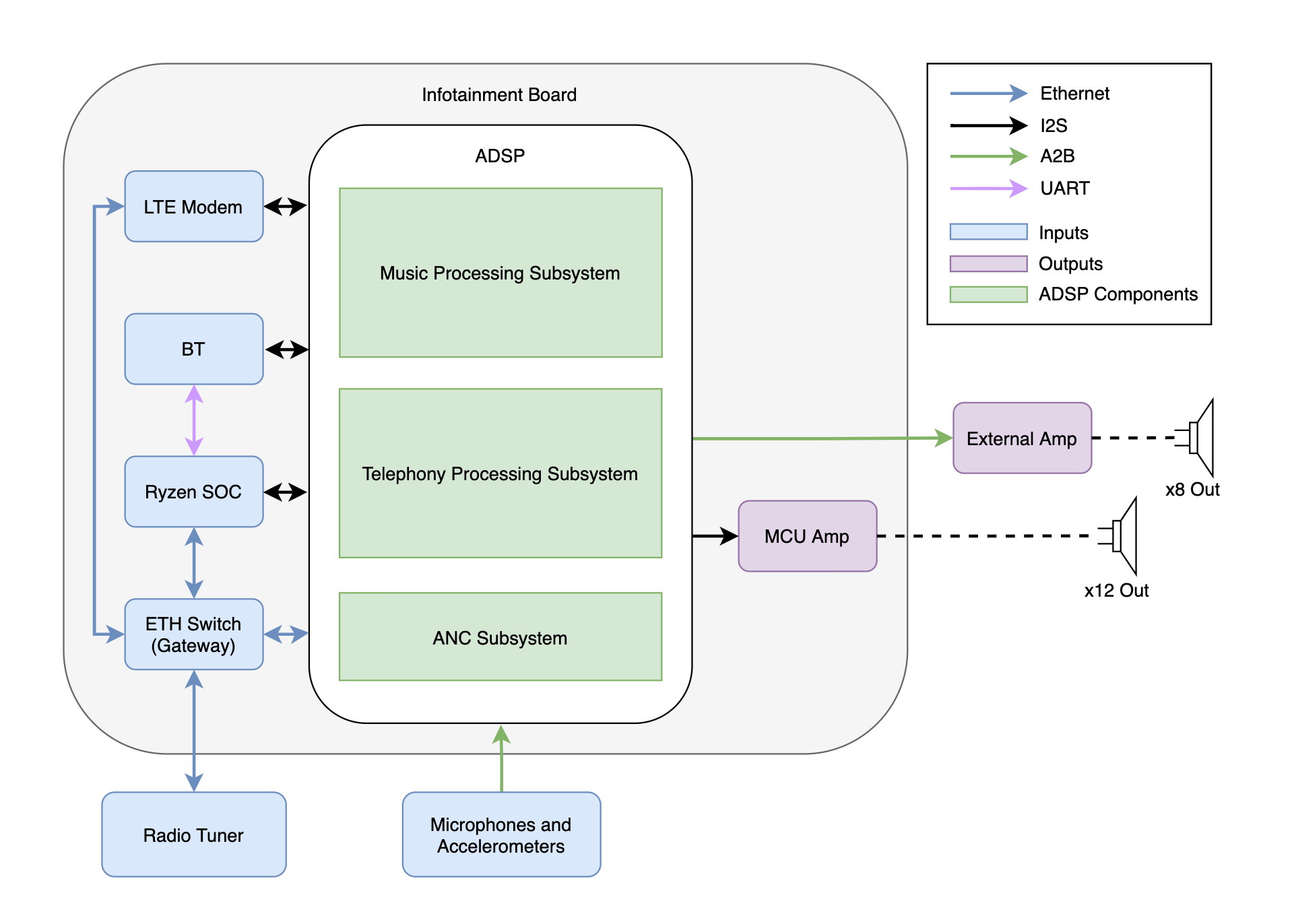 A high-level architecture diagram of the inputs and outputs to the ADSP is shown in the image below. The external amplifier is located in the trunk of the vehicle, while the MCU amplifier is a collection of 3 amplifiers located on the Infotainment Board.