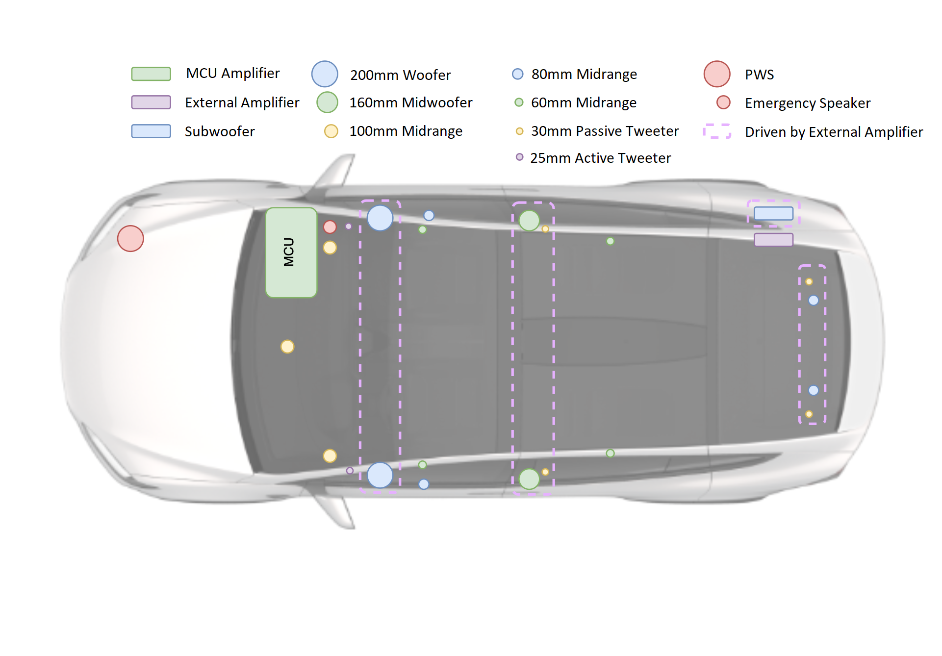 2021+ Model X contains 24 speakers. The diagram below outlines the placement of the speakers and their amplifier configuration.