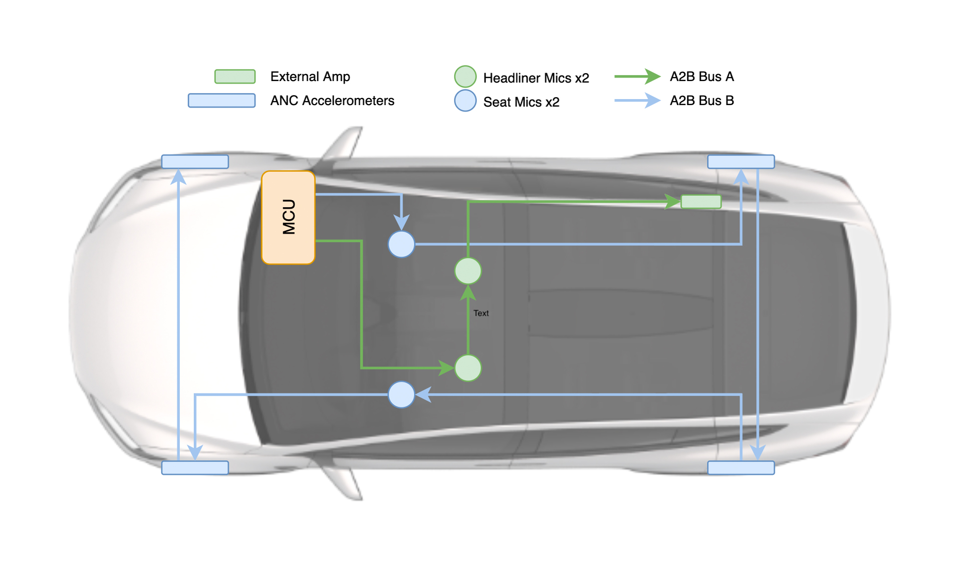 2021+ Model X contains 2 A2B audio busses: A2B Bus A and A2B Bus B. The A2B Bus A is used for the main audio system, and connects the Infotainment Board to the headliner mics and rear external amplifier. The A2B Bus B is used for the ANC system, and connects the Infotainment Board to the seat microphones and accelerometers.