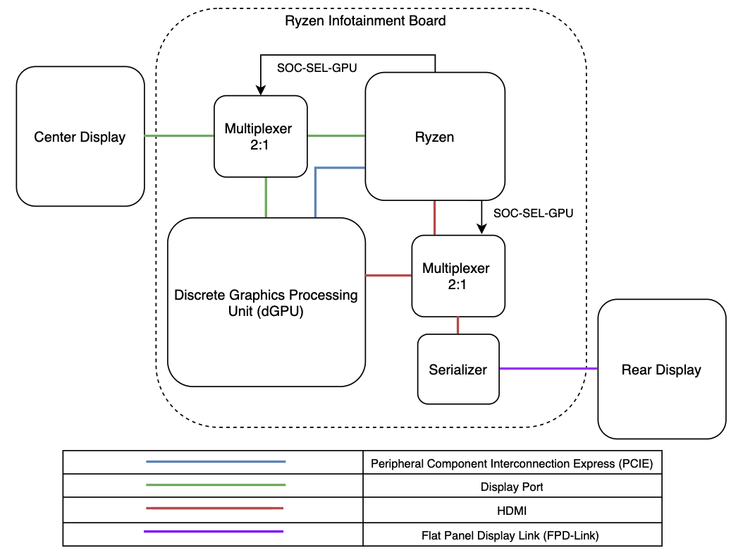 The dGPU communicates with the Ryzen directly over a peripheral component connection express. The Ryzen also controls two multiplexers which switch inputs between the dGPU and Ryzen for each display. A display port connection is used for the dGPU to connect with the touchscreen, and a HDMI connection is used to connect the to the rear display serializer which then connects to the rear display over a flat panel display link.