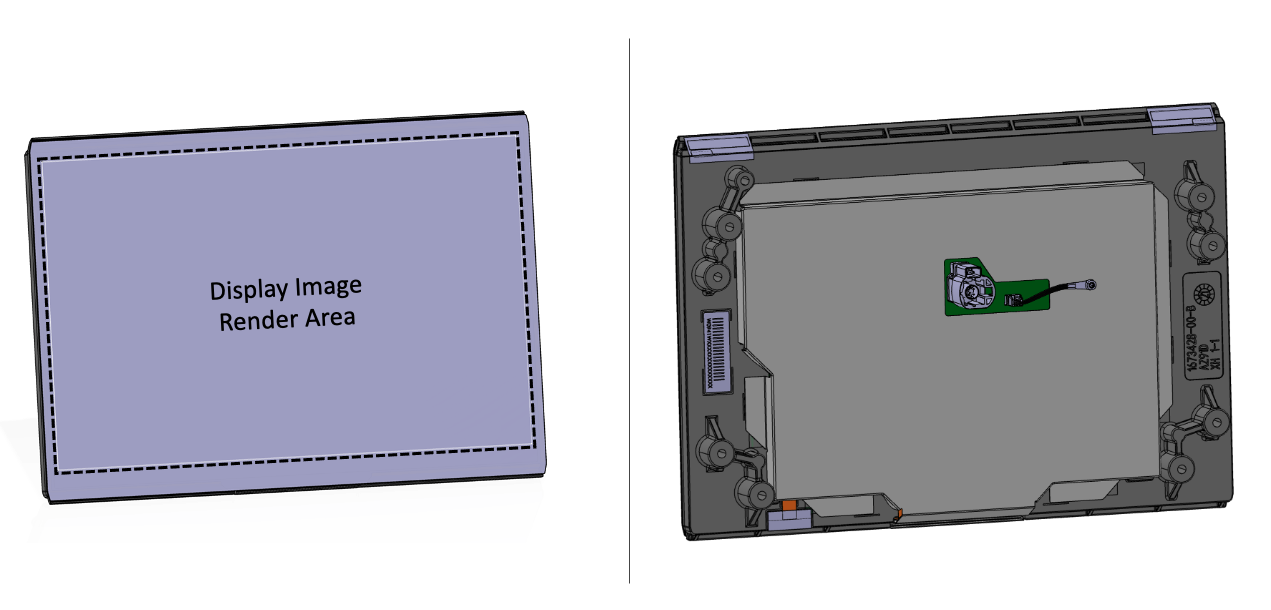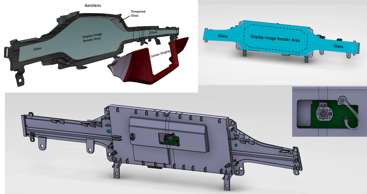 The vehicles instrument cluster (IC) is a 12.3" high definition display which has it's attached glass extends beyond the image render area accommodating the AreoLens instrument panel design. The display is connected to the car computer via a HSD+2 cable with the HSD portion carrying serialized data and the +2 portion providing power and ground for the display LED's and buck converter.