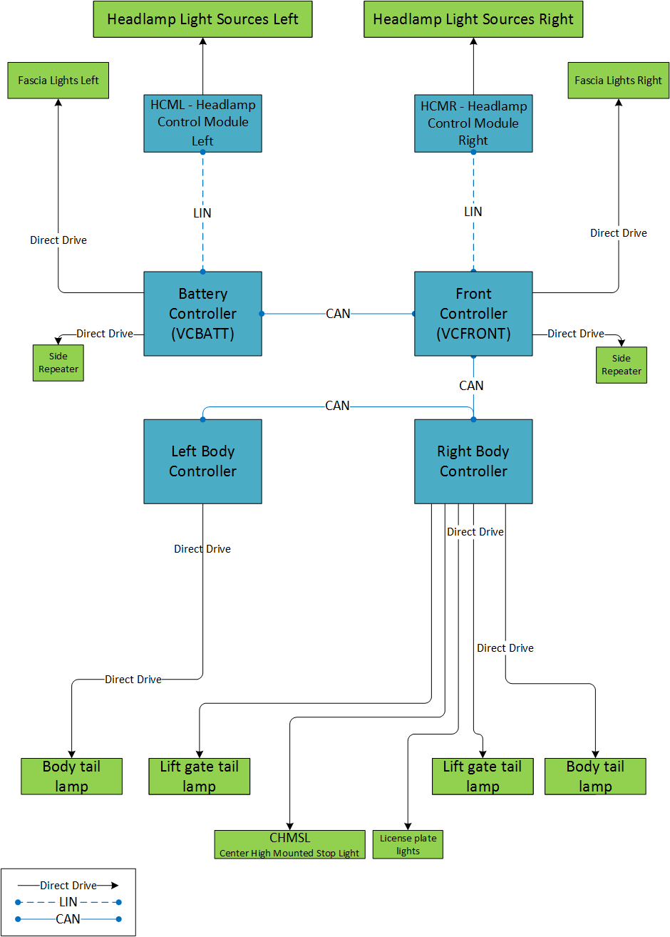 The exterior lighting system control is distributed between the vehicle controllers as depicted in the diagram below. The front headlamps have their own ECU and are receiving signals from the vehicle controllers over LIN bus. The rear lights consist of the body and lift gate tail, stop lights, and the license plate lights. They are managed by the left and right body controllers.