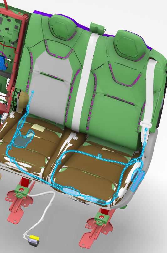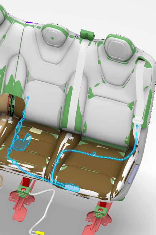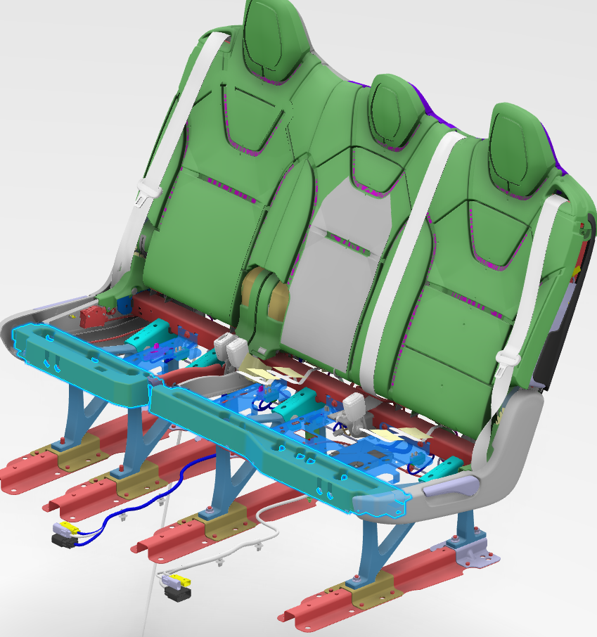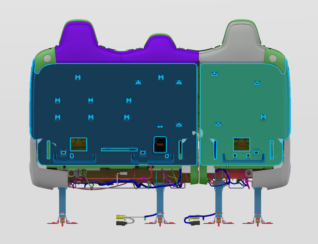 The second row is comprised of two separate backrest frames. The 60% and the 40%. The 40% contains the right hand second row passenger and the 60% contains the left hand and center passenger positions, with the center position being referred to as the 20%. For 2021+ Model X, these structures are stand alone frames with the seat cushion bench being one piece that sits atop the Ancillary Bay.