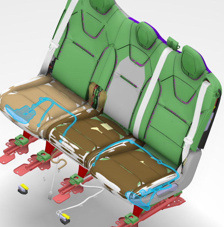 Because the 60% is a heavier seat back, recliner mechanisms are located on both the inboard and outboard sides. The cable system that pulls on the recliner mechanism must pull the cable on each side simultaneously. This is done with a recliner splitter box, the cable attached to the lever feeds into a splitter box that then pulls both cables on each recliner mechanism simultaneously.
